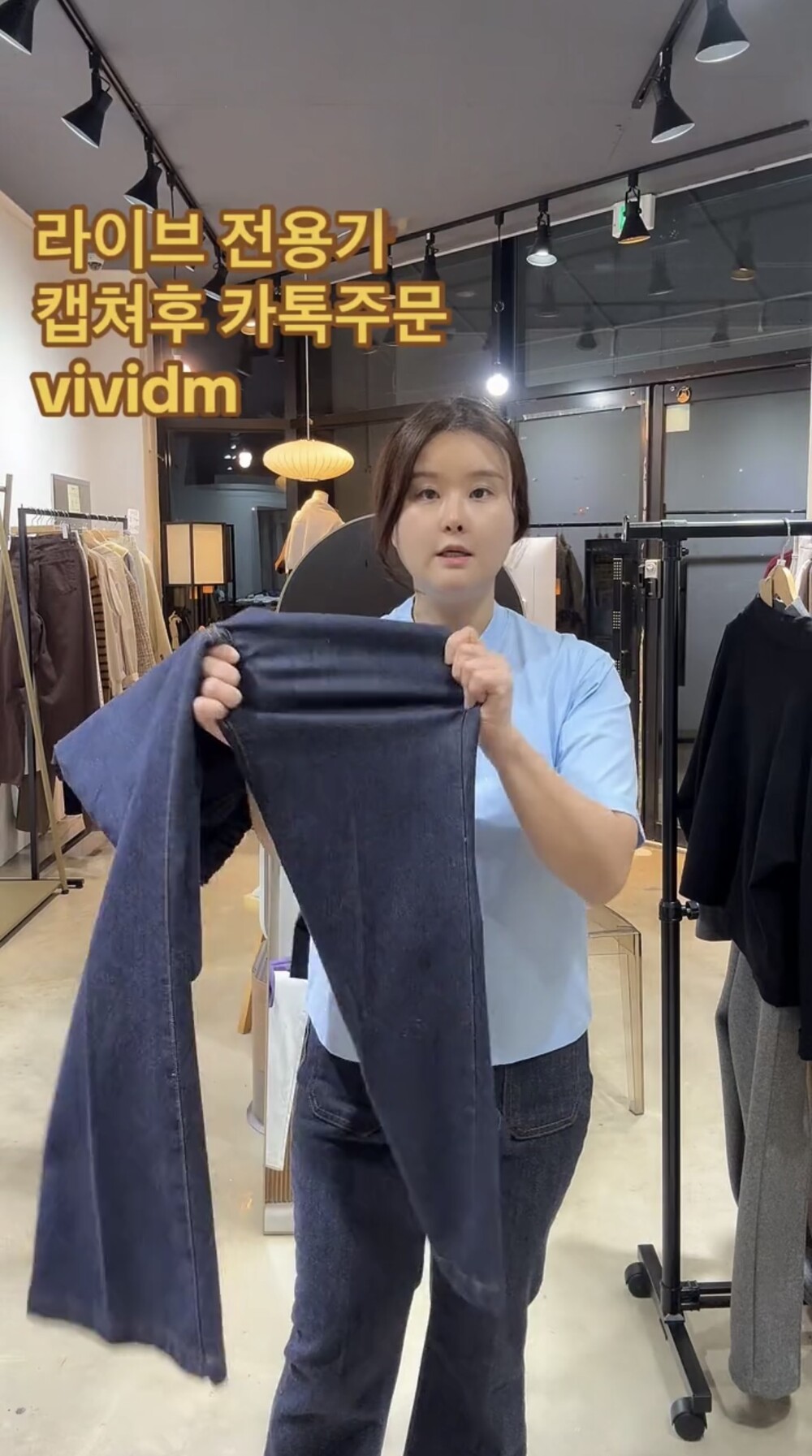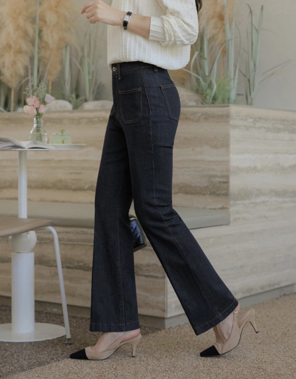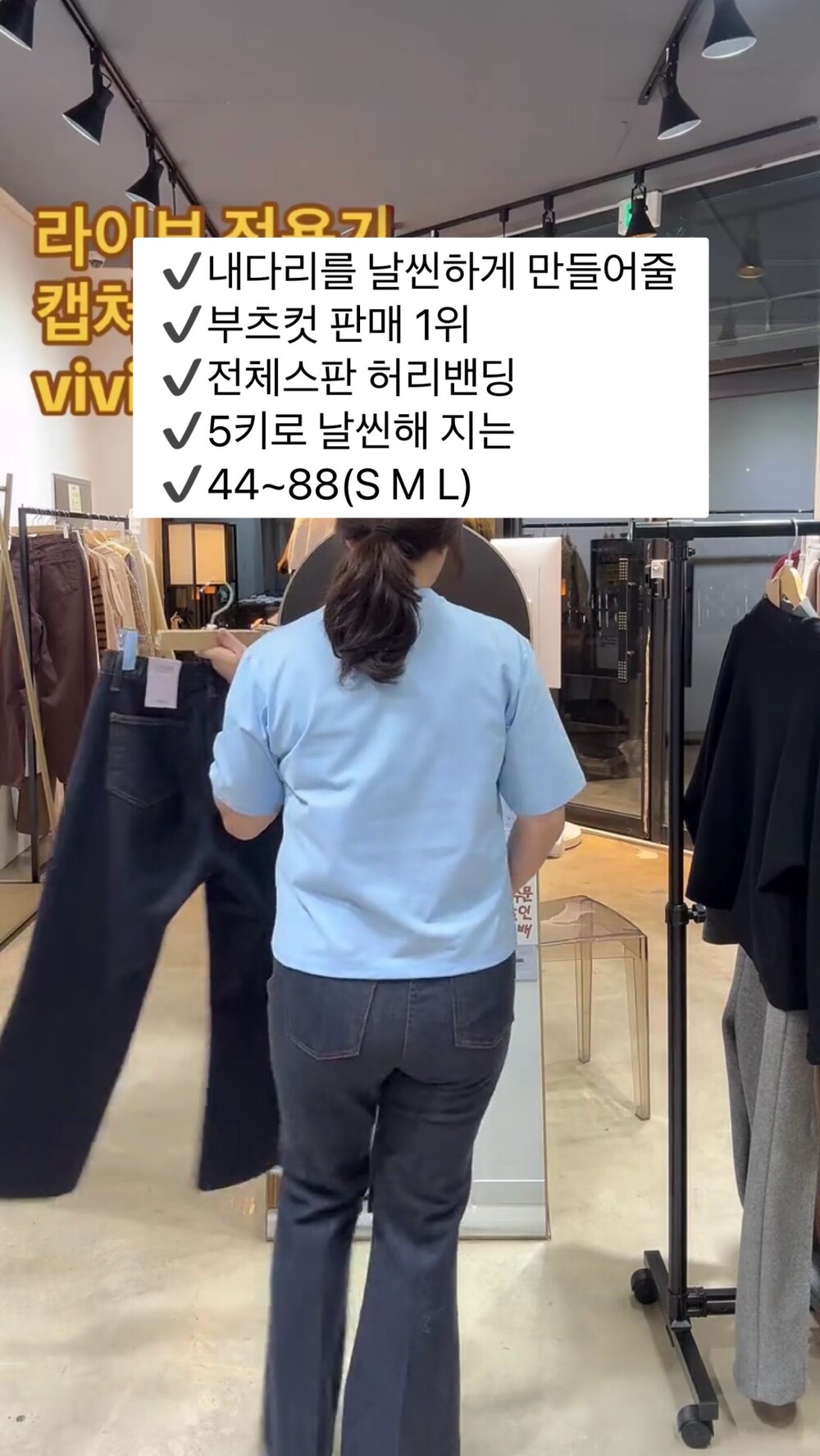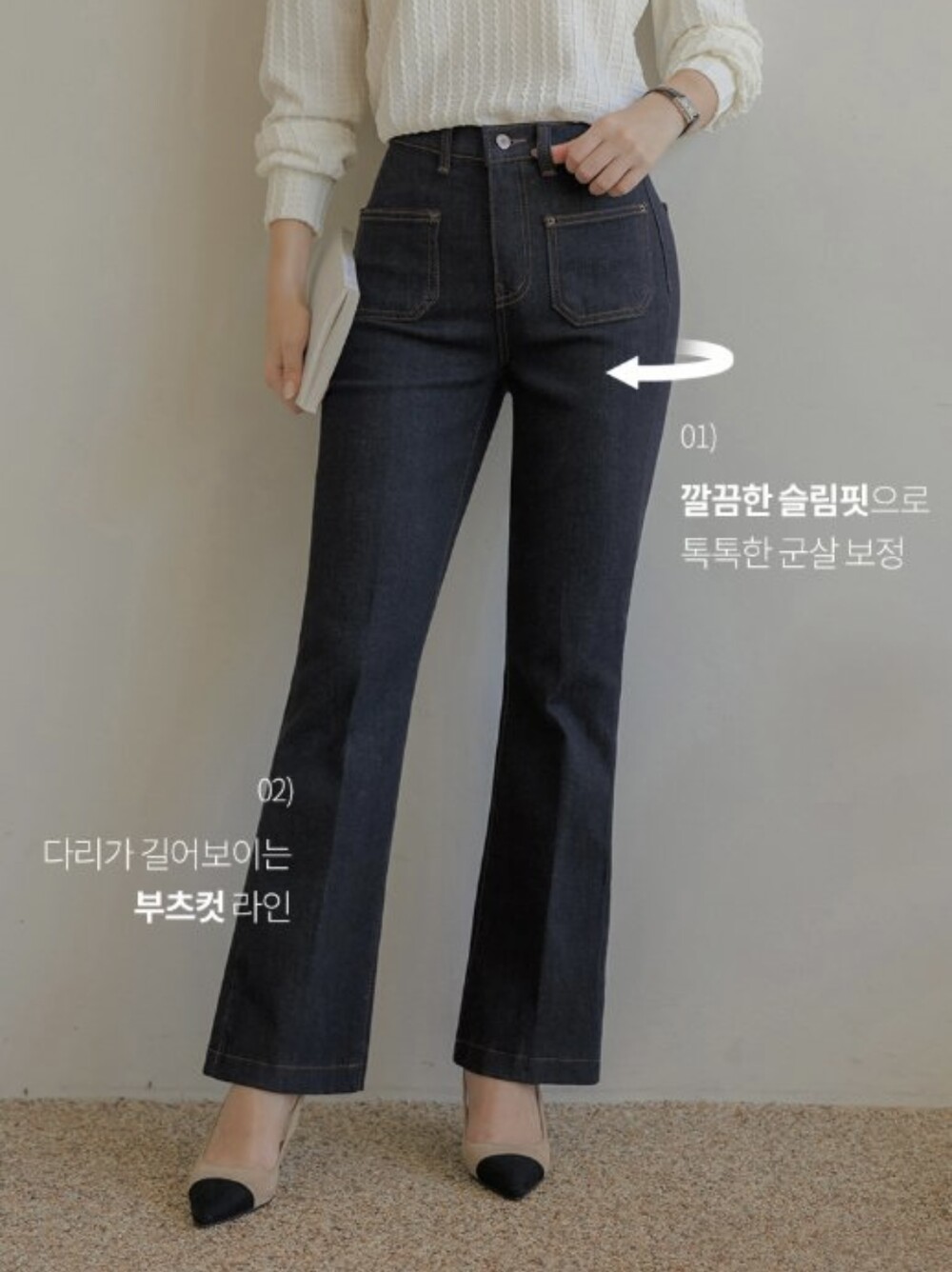 사이즈팁-원단 전체 스판,허리 전체 밴딩으로 쭉뻗은 진청의 부츠컷 라인이 다리라인을 슬림하게 연출해 드려요.