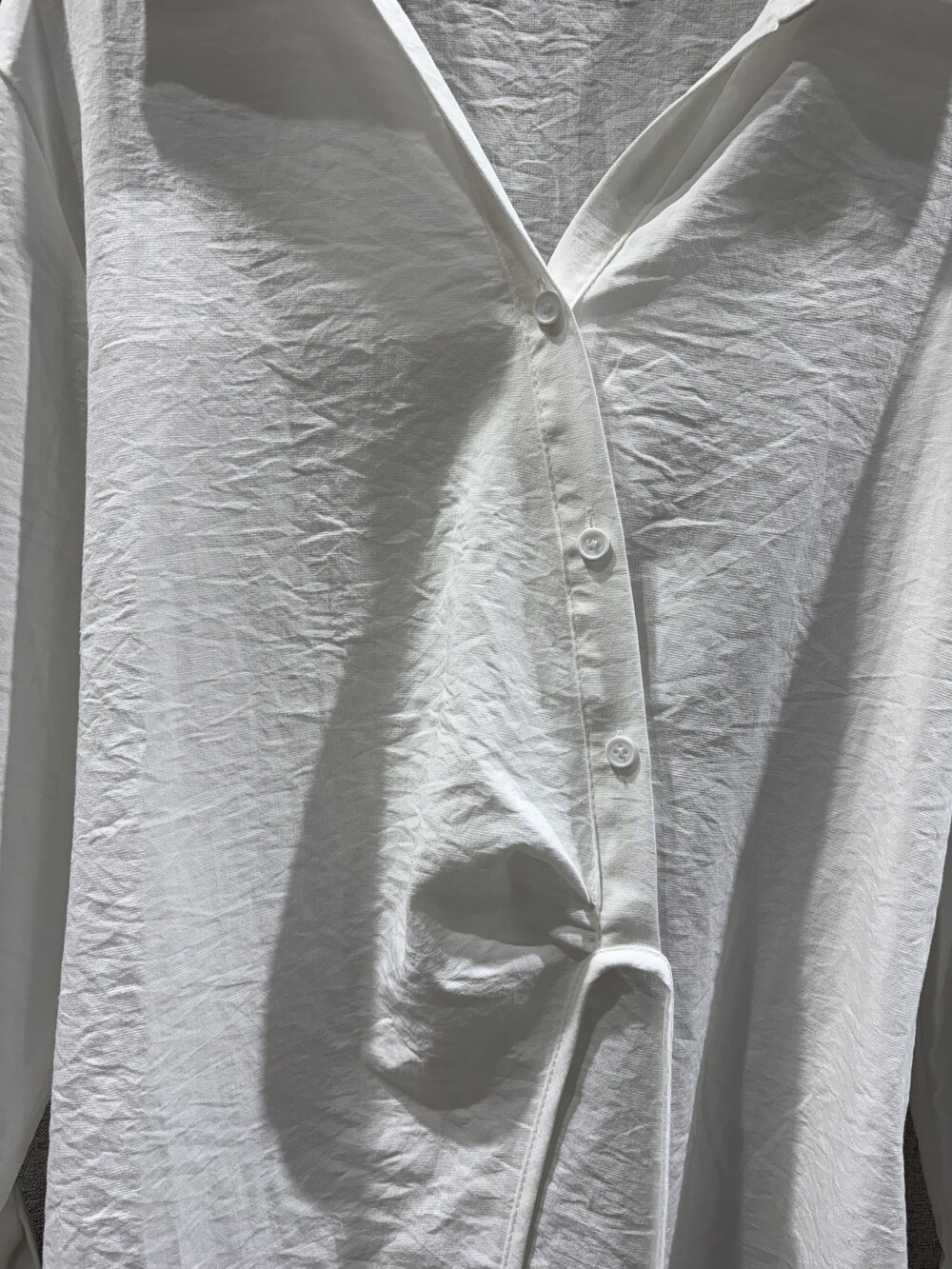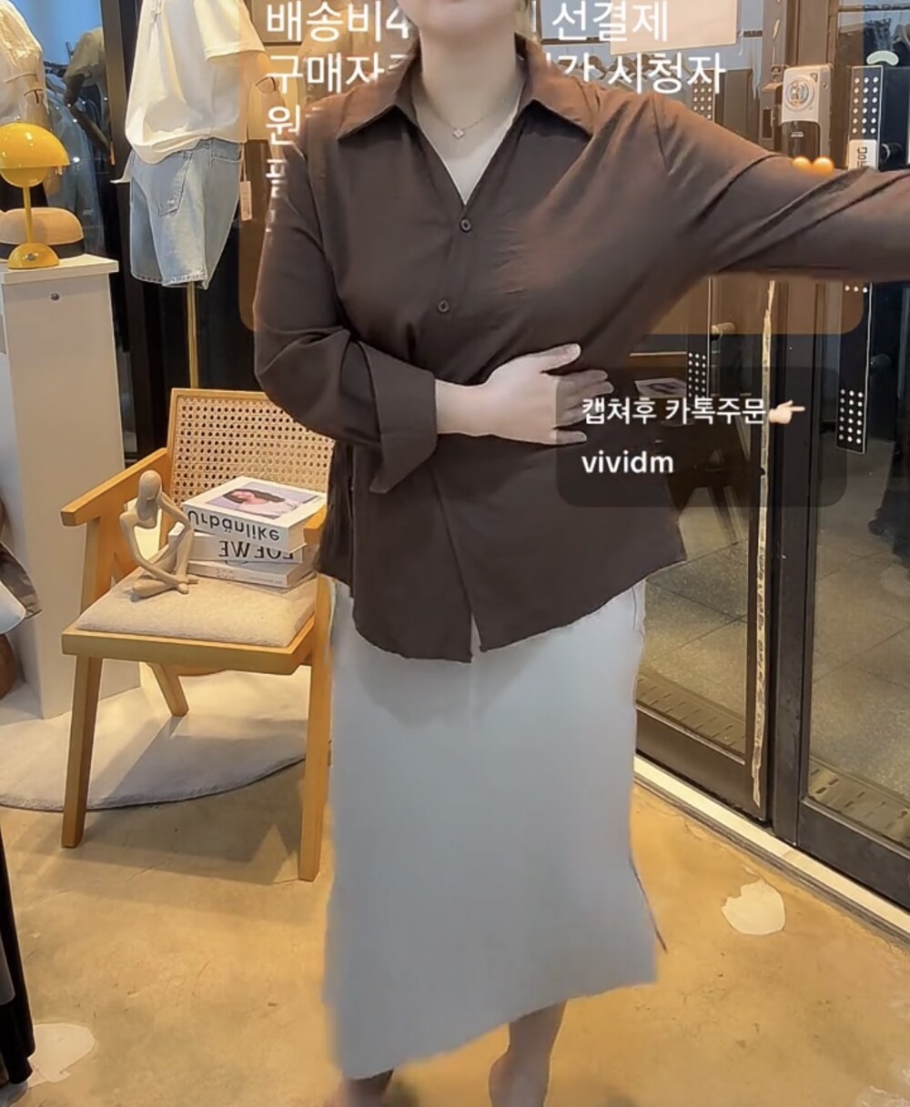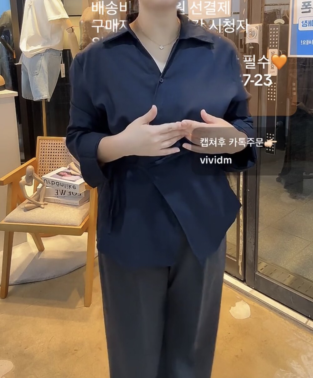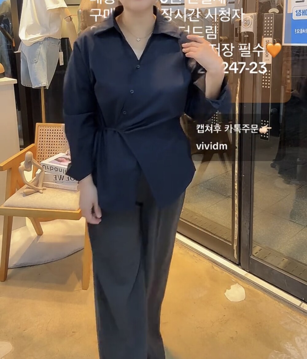브이넥 네크라인이 목선을 길어 보이게 하며 여성스러움을 더합니다.